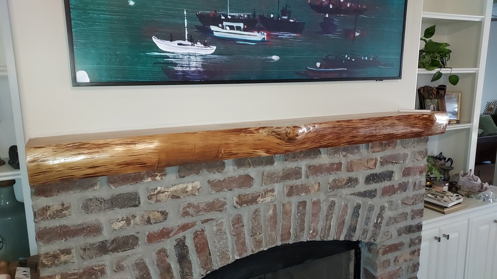 This is an example of a live edge mantle shelf. Whether live edge or smooth, finished front your fireplace with be the focal point of the room.